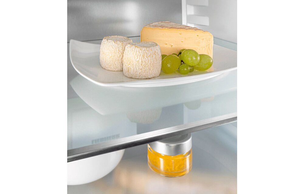 De koelkast is uitgerust met verstelbare GlassLine draagplateaus, die belastbaar zijn tot 35 kg. Deze plateaus zijn eenvoudig te verstellen, zelfs bij een deuropening van 90 graden, waardoor u de indeling naar wens kunt aanpassen. Alle interieuronderdelen zijn bovendien vaatwasmachinebestendig, wat het schoonmaken vergemakkelijkt.
